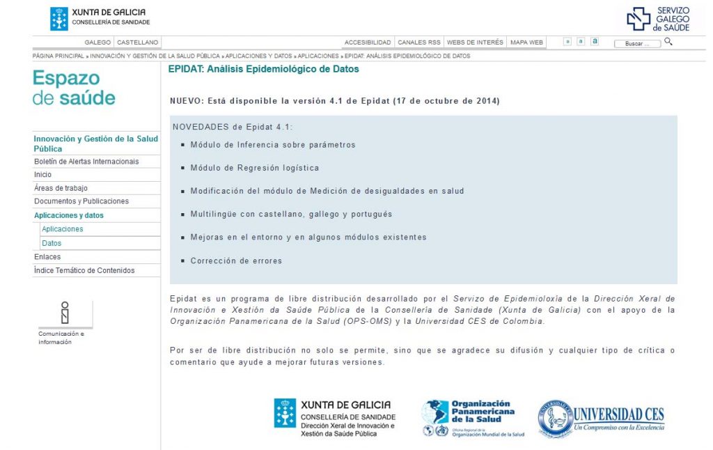 Desde el 17 de octubre, ya está disponible la versión 4.1 de EPIDAT, programa para análisis epidemiológico y estadístico desarrollado por la Dirección Xeral de Innovación e Xestión da Saúde Pública de la Consellería de Sanidade (Xunta de Galicia) con el apoyo de la Organización Panamericana de la Salud (OPS-OMS) y la Universidad CES de Colombia.